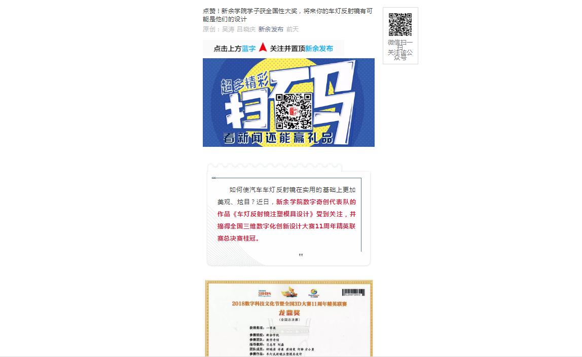 【媒体看机电-新余发布】点赞!世界足球官网学子获全国性大奖,将来你的车灯反射镜有可能是他们的设计