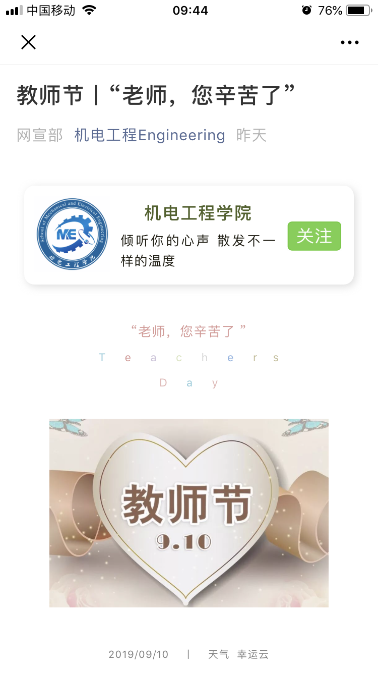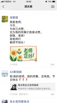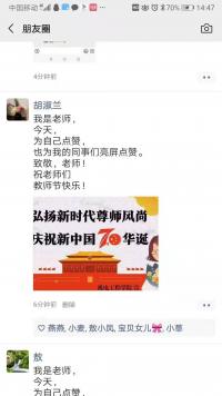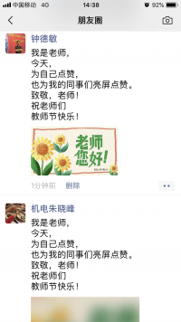 为教师亮灯,大力弘扬尊师文化。为倡导尊师重教,引导员工感念师恩、礼敬教师,努力营造浓厚的教师节氛围,该学院按照学校统一安排9月10日19:30点至22:30,在机电楼LED电子屏为 教师“亮灯”,滚动播放“老师,您好!”“等字幕,大力弘扬尊师文化,增强了广大教职工的职业自豪感、工作责任感。此外,该学院还在在全院老师中开展我是老师,朋友圈亮屏点赞拇指活动,活动得到了全体教师积极参与,一时间朋友圈里为老师亮屏点赞达数千人。