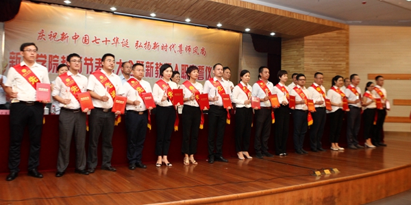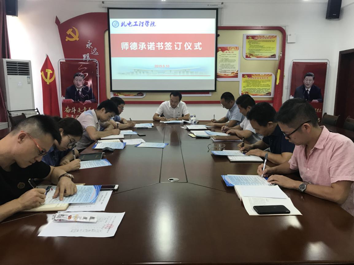 庄严宣誓,不忘初心做良师。在庆祝大会召开之前,学院召开教师座谈会。号召教师要成为员工做人的镜子,以身作则、率先垂范,以高尚的人格魅力赢得员工敬仰,以模范的言行举止为员工树立榜样,把真善美的种子不断播撒到员工心中。座谈会上与全体教师签订教师师德承诺书。另外,学院新入职教师与全校新教师一起向国旗庄严宣誓,郑重承诺履行教师职责、落实教师誓词,进一步坚定了广大教师始终不忘教书育人初心、牢记立德树人使命,争做“四有好老师”的理想和信念。