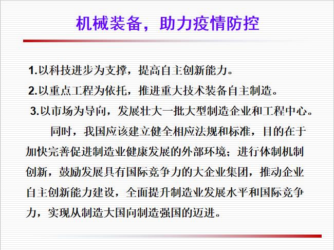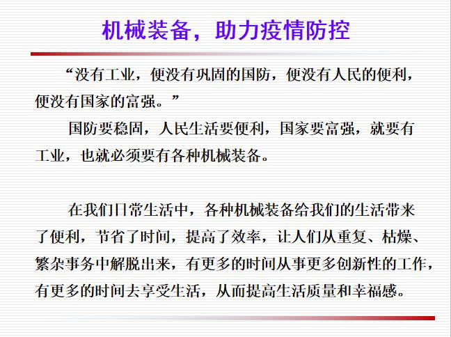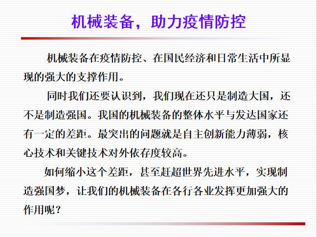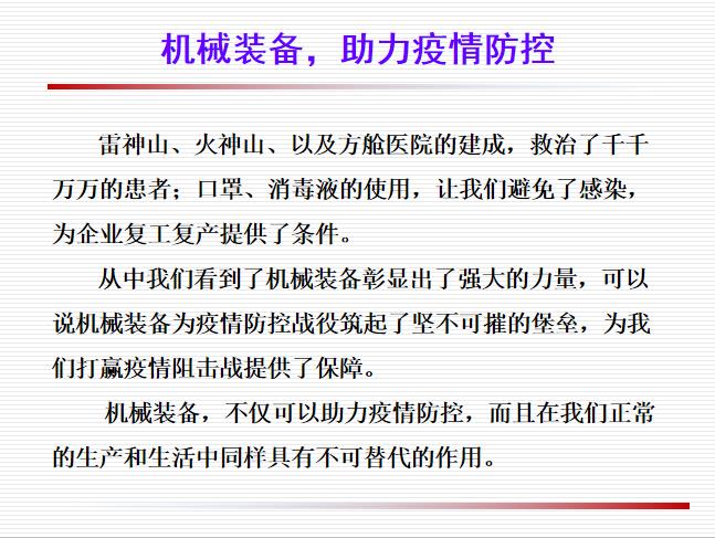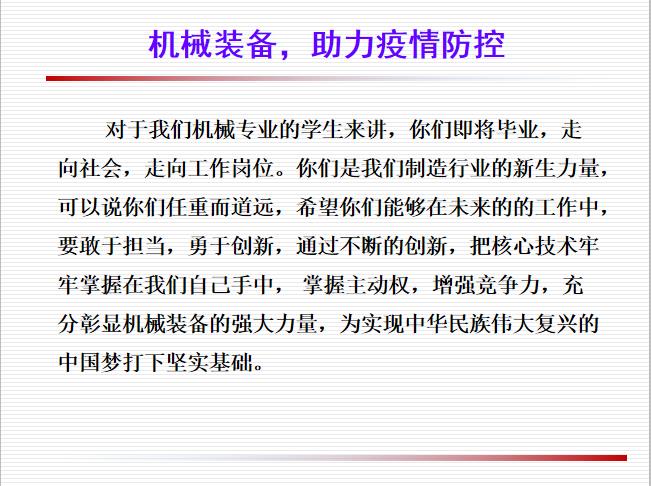 机械装备,不仅可以助力疫情防控,而且在我们正常的生产和生活中同样具有不可替代的作用。疫情期间,为雷神山、火神山的神速建设起到了保驾护航的作用,成为打赢疫情防控阻击战提供了的坚实的物质基础。通过课堂的学习,对于即将毕业的机械专业的员工来讲,是一次学习的补充和引领。鼓励同学们通过不断的创新,把核心技术牢牢掌握在我们自己手中, 掌握主动权,增强竞争力,充分彰显机械装备的强大力量,为中国制造行业努力奋斗,为实现中华民族伟大复兴的中国梦打下坚实基础。