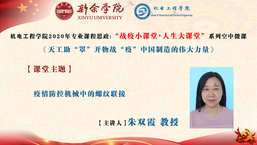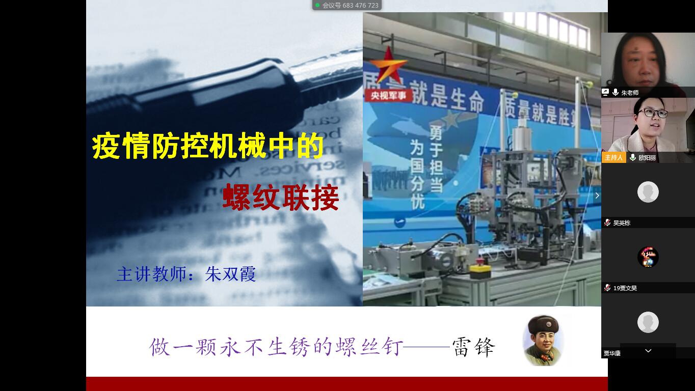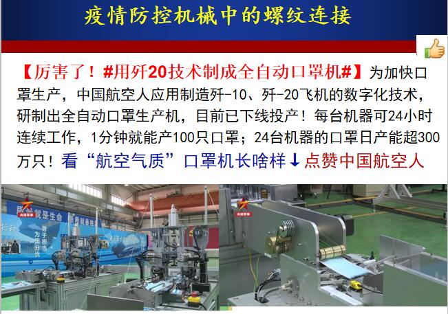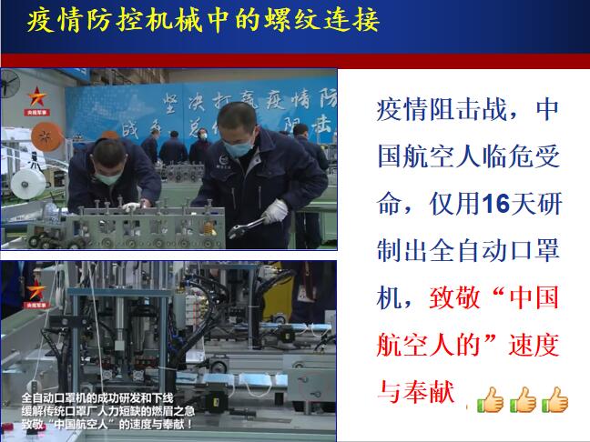 螺纹连接件在这些疫情防控机械中广泛应用。通过课堂疫情防控机械中螺纹连接相关知识的学习,使员工了解螺丝钉虽小,却是最坚固的基础,没有它,机器就无法正常运转,增强大家对连接在机械设计与使用中占有重要地位的认知。同时激励同学们要有像螺丝钉一样的专研精神,勤奋学习,用知识武装自己,为国家富强和民族振兴多做贡献。