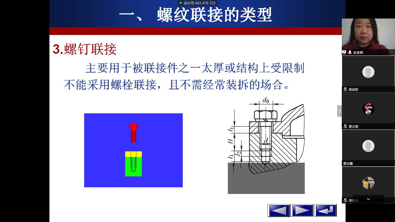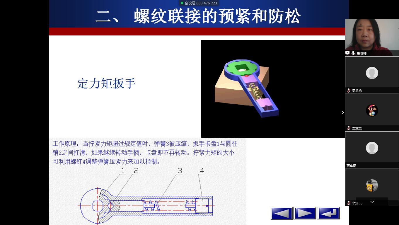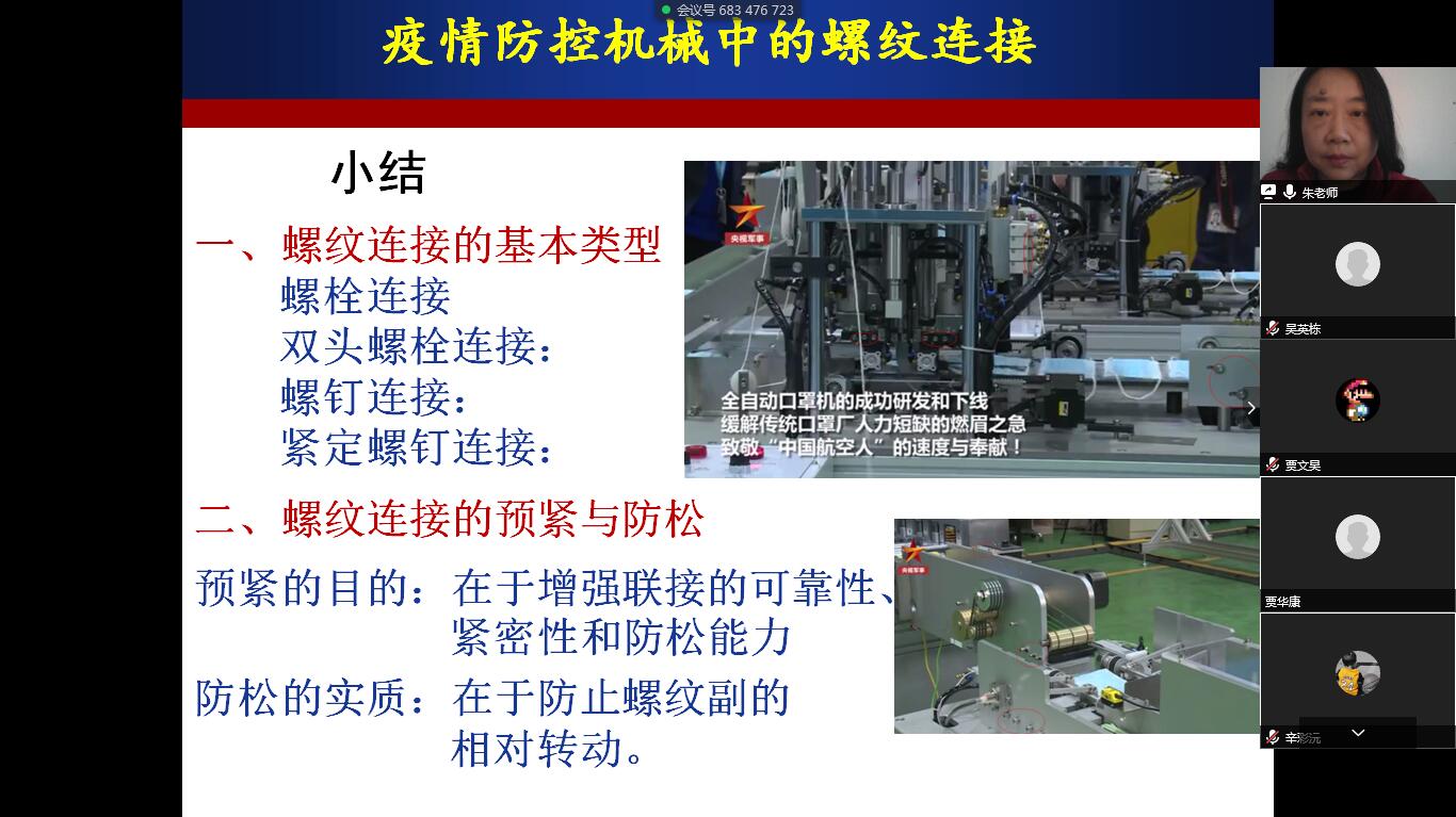 这一讲,朱双霞教授带领同学们学习了螺纹连接的类型、螺纹的预紧与防松等课程内容。通过学习,大家是不是知道了螺纹连接要正常工作的话,我们要给它既要预紧又要防松。同学们呢?我们是中华民族复兴大业当中,关键一棒,肩负着重要使命与责任,所以大家在大学学习期间,千万不能松懈,要不断自我加压,自觉的用知识武装自己,积极地培养自己的创新意识和创新能力,为国家富强和民族振兴作贡献。