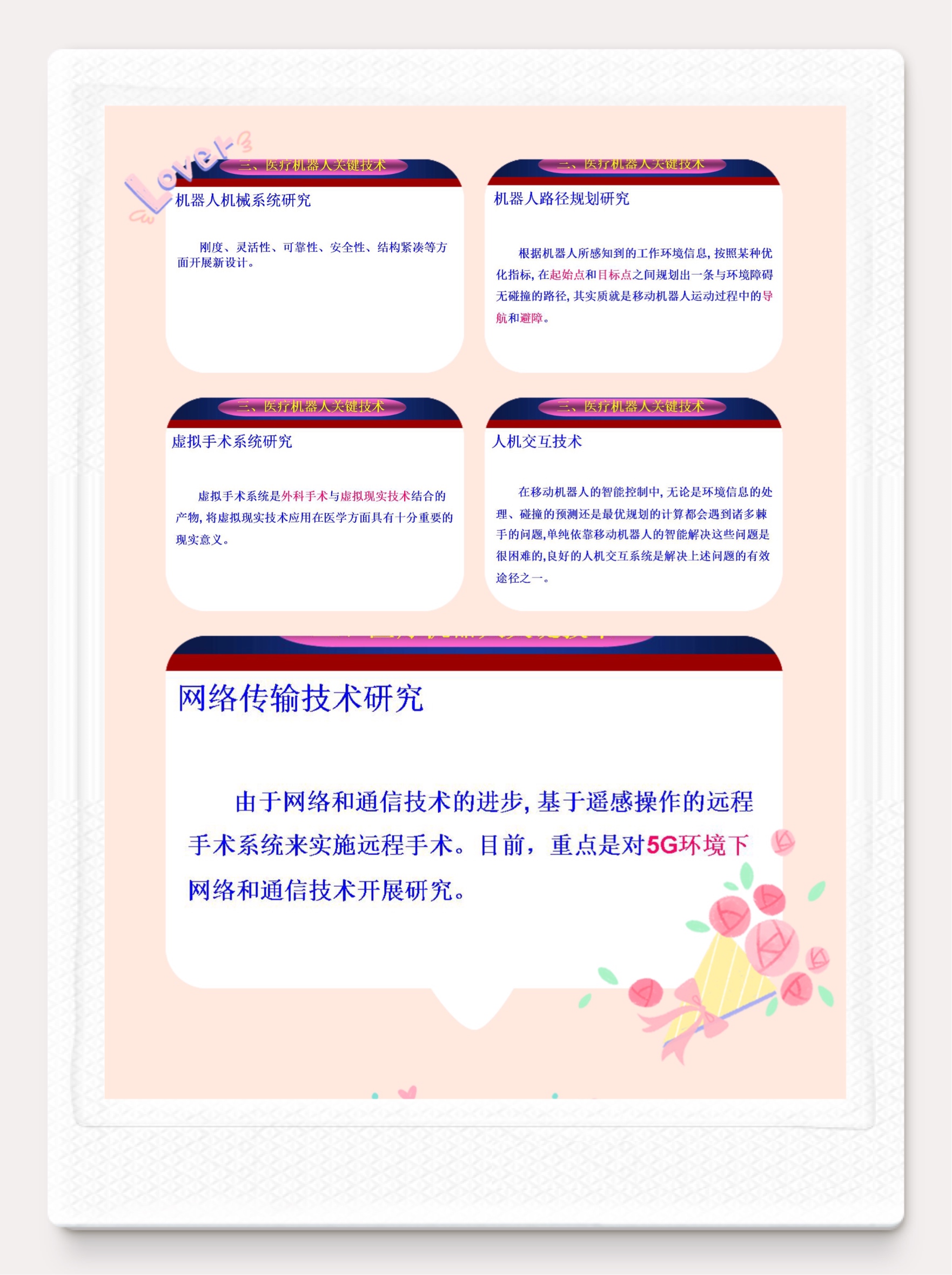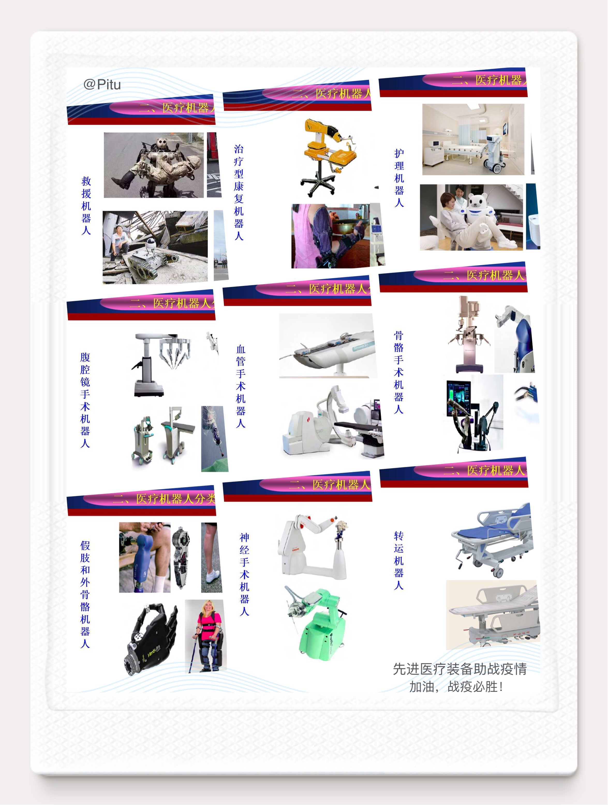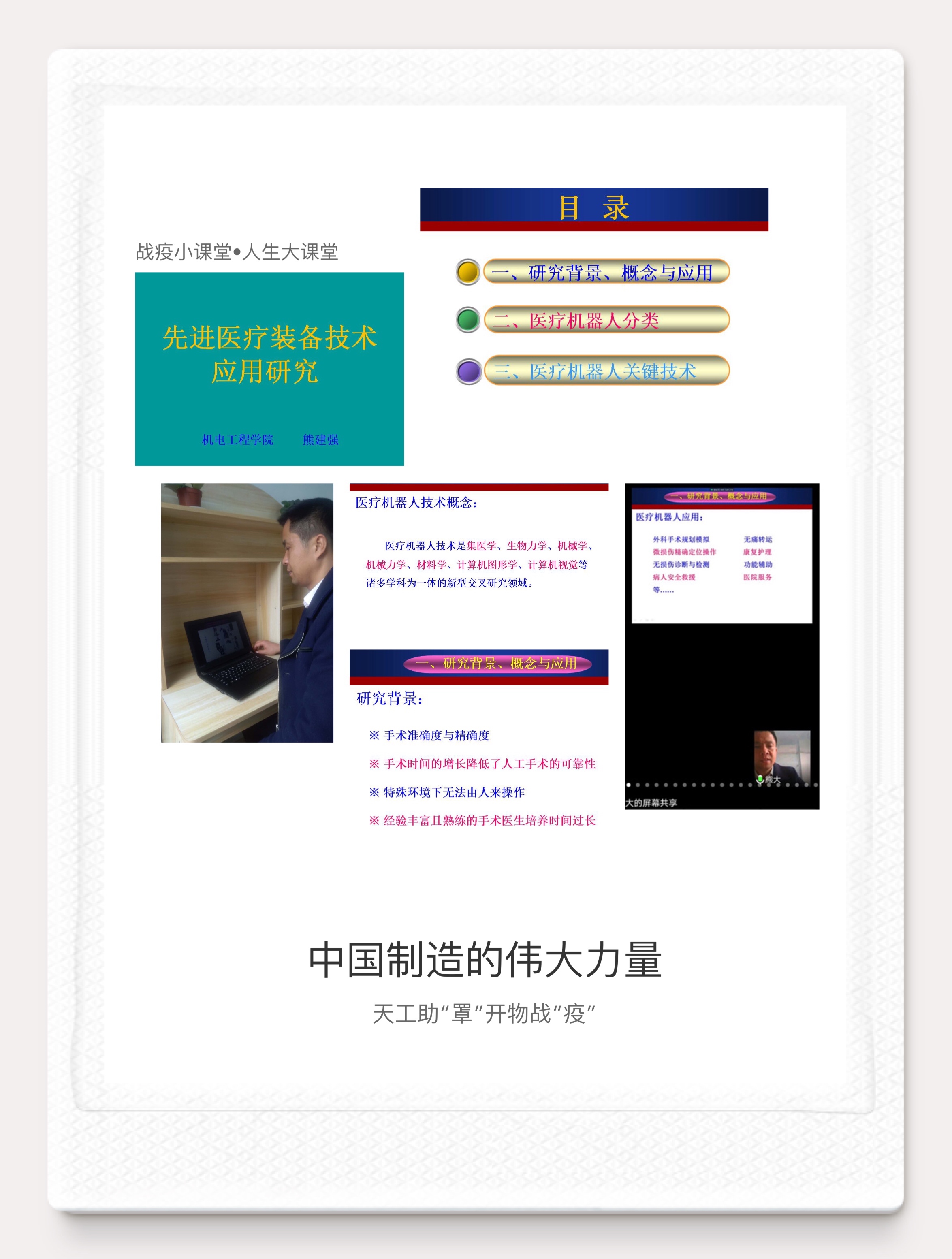 面对突如其来的新型冠状病毒感染肺炎疫情,各地都启动了重大突发公共卫生事件一级响应,一场“内防扩散,外防输出”新冠肺炎全国阻击战已全面打响。随着机械学、材料学、生物力学、计算机图形与视觉等学科的交叉融合发展,催生了转运机器人、手术机器人、康复机器人、护理机器人、救援机器人等先进医疗装备,在此次高传染性新冠肺炎疫情防治中发挥着重大作用。通过课堂学习,增强同学们的专业学习热情、奉献精神、爱国情怀和实现中国梦的奋斗之志。