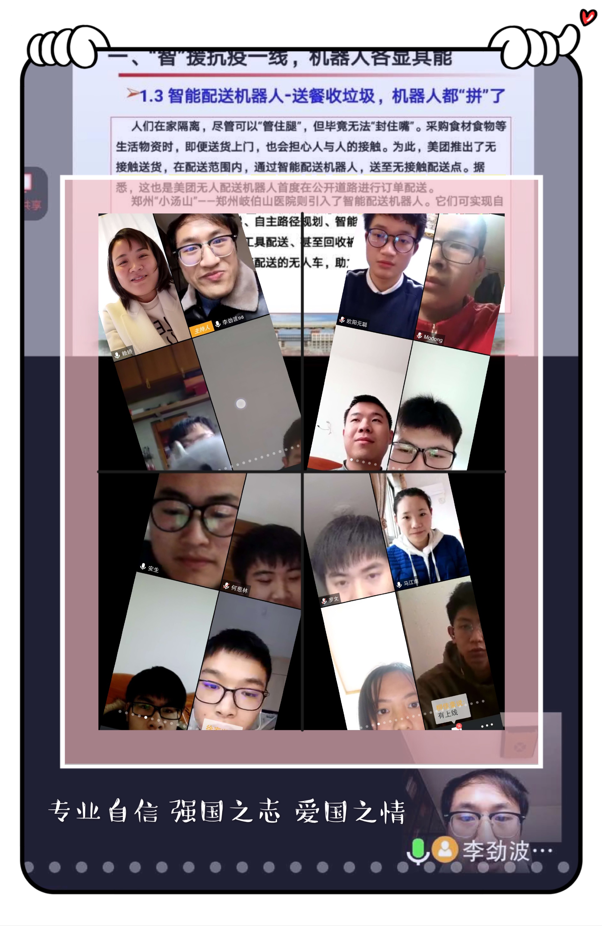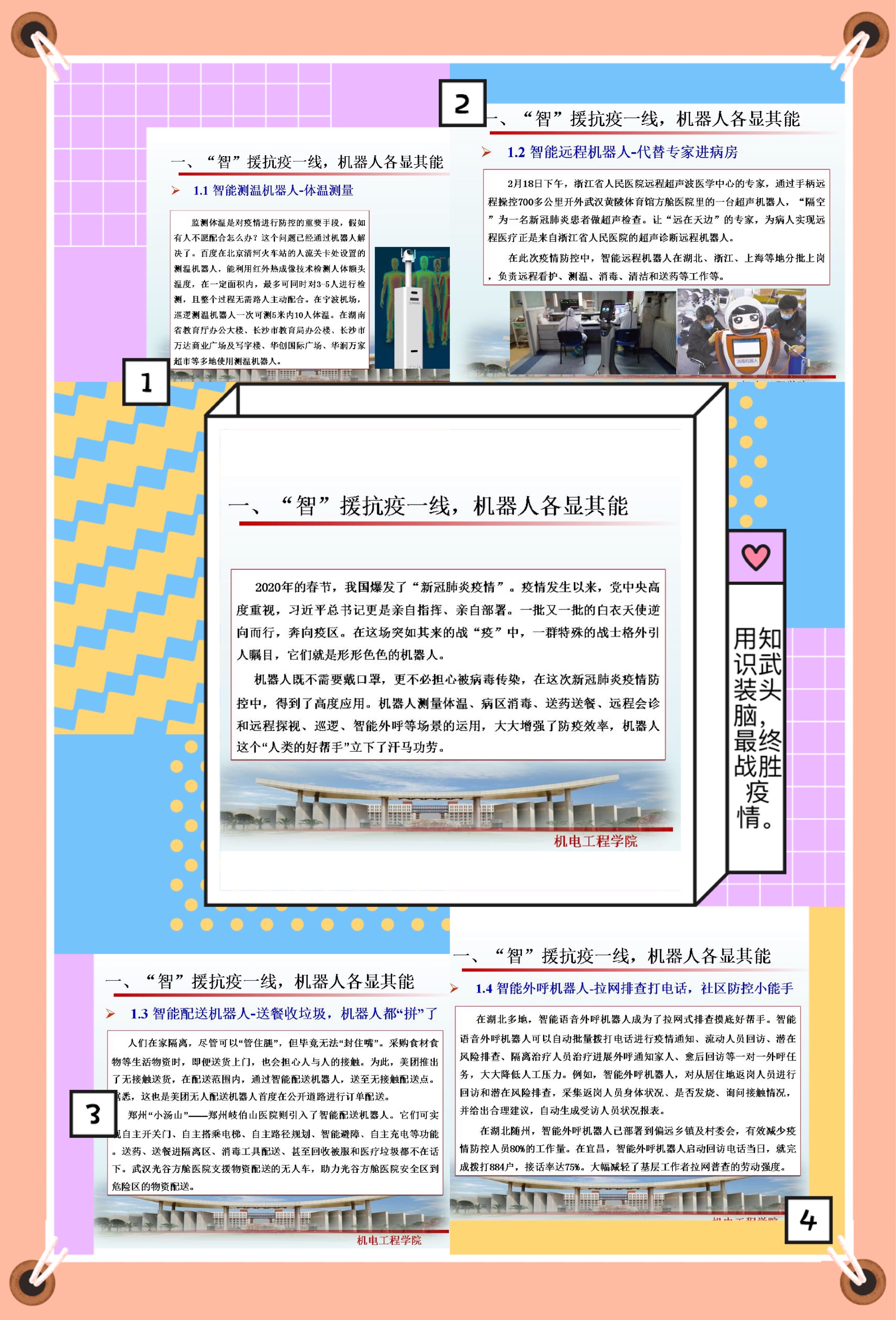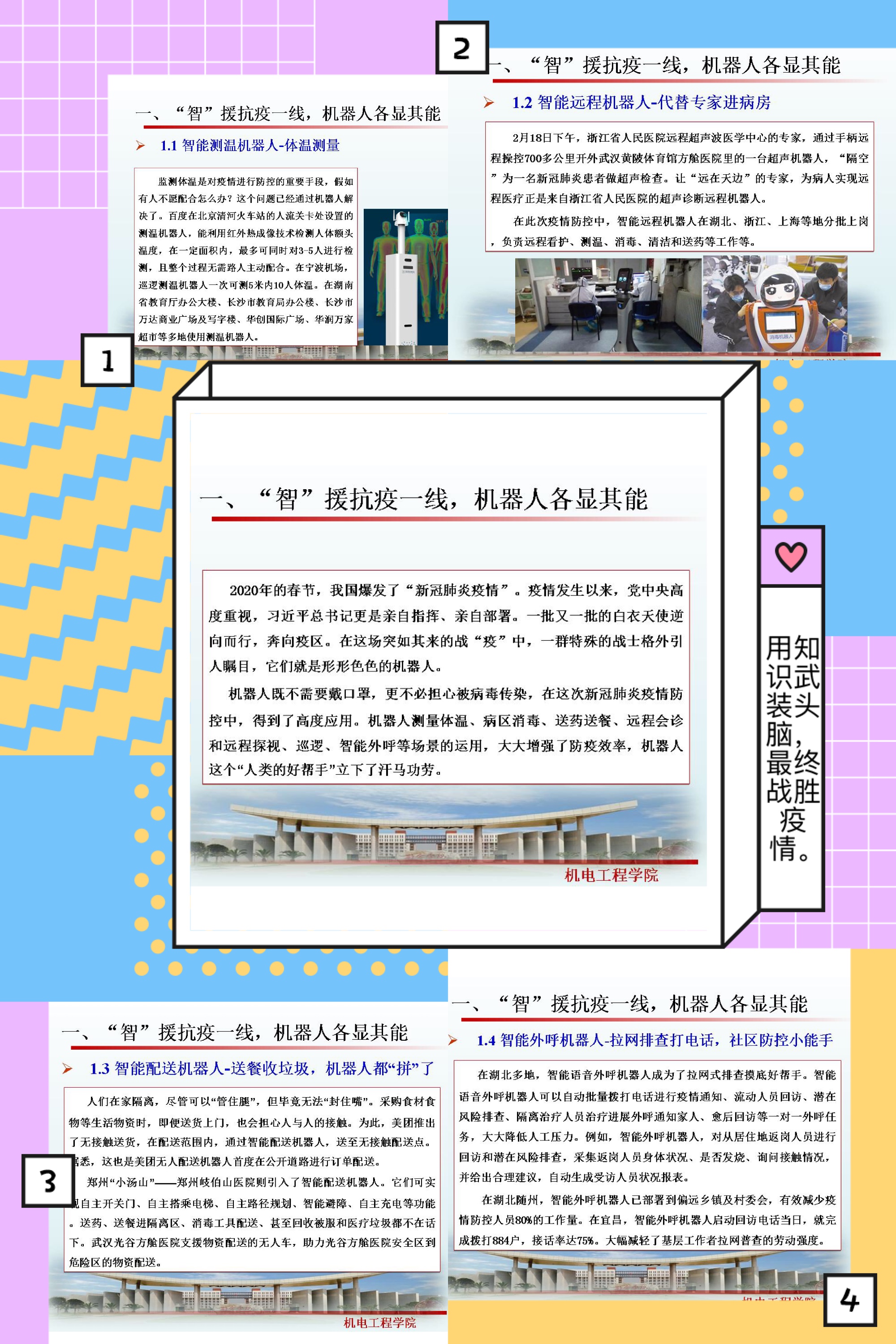 突如其来的新型冠状病毒感染引发的肺炎疫情席卷而来,牵动着全国人民的心。一场为阻断疫情肆意扩散,防止进一步蔓延的战役全面打响。新技术催生下的智能机器人如:智能测温机器人、智能远程机器人、智能疫情防控机器人、智能配送机器人等智能产品都出现在疫情防控第一线,在增强疫情防控效率、降低医患交叉感染风险以及抑制病毒扩散中发挥了重大作用。通过课堂的学习,增强同学们相关技术信息和创新思路,和跨界的融合与协同,激发员工学习热情,以扎实的专业知识投身中国梦的伟大实践,将青春热血奉献在祖国最需要的地方。