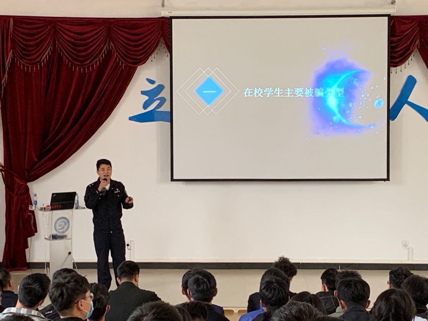 段警官首先分析了当前网络电信诈骗犯罪活动的形势,他指出,近年来,电信网络诈骗形式多样,受骗人数持续上升。随后,段警官结合实际案例,归纳总结了电信诈骗的主要类型和特点,进一步揭露了常用作案手法和犯罪伎俩,借以提醒同学们树立正确的消费观念,防范校园贷、套路贷等诈骗陷阱。