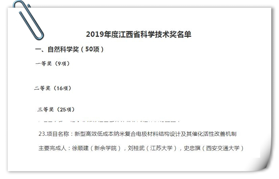 本站讯:从省政府网站获悉,名单公布。徐顺建教授团队项目《新型高效低成本纳米复合电极材料结构设计及其催化活性改善机制》,经专家评审,获得2019年度江西省科学技术奖三等奖。该奖项的获得实现了学校在省自然科学奖项中的零突破,同时也是实现了新余市获得省自然科学奖的零突破。