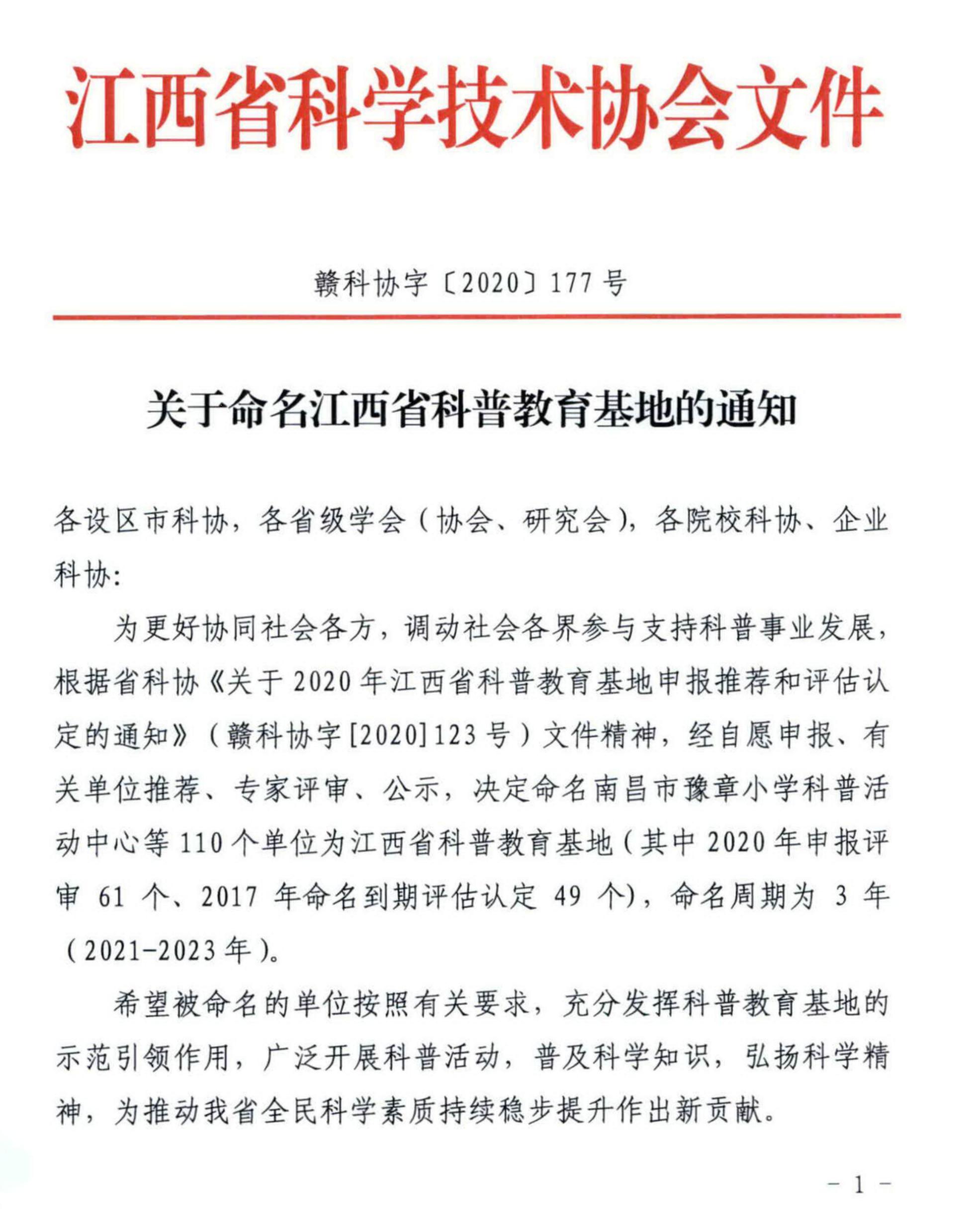 据省科协《关于2020年江西省科普教育基地申报推荐和评估认定的通知》(赣科协字[2020]123号)文件精神,经有关单位推荐、专家评审、公示,世界足球官网被正式命名为“江西省科普教育基地”,并于2021年4月9日召开的新余市科协系统工作会议中正式授牌。