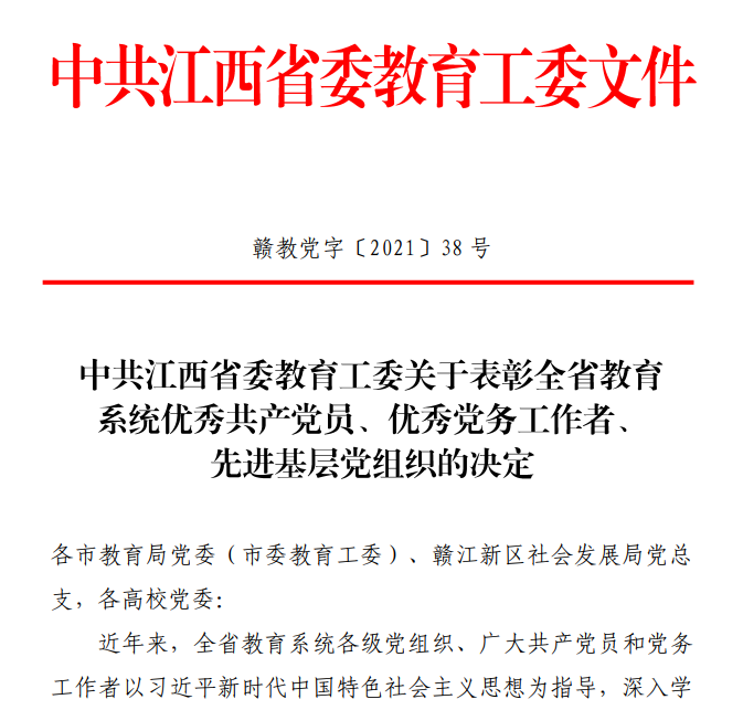 近日,中共江西省委教育工委下发了《关于表彰全省教育系统优秀共产党员、优秀党务工作者、先进基层党组织的决定》,世界足球官网被评为全省教育系统先进基层党组织;同时学院老师彭梅香被评为全省教育系统优秀共产党员。