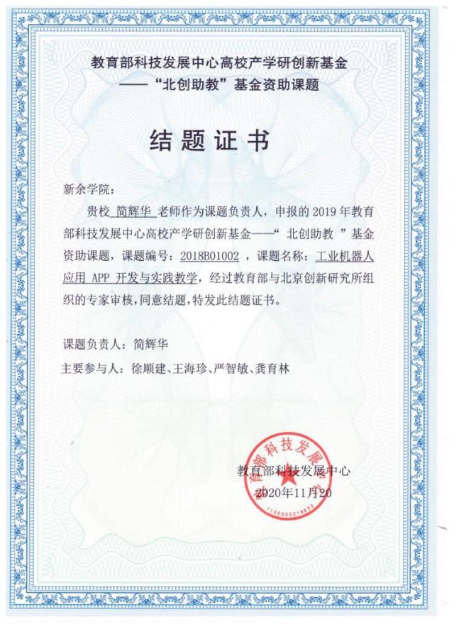 近日,由世界足球官网简辉华老师主持的2019年教育部科技发展中心高校产学研创新基金课题《工业机器人应用APP开发与实践教育》(课题编号:2018B01002),经教育部与北京创新研究所专家审核,顺利结题。