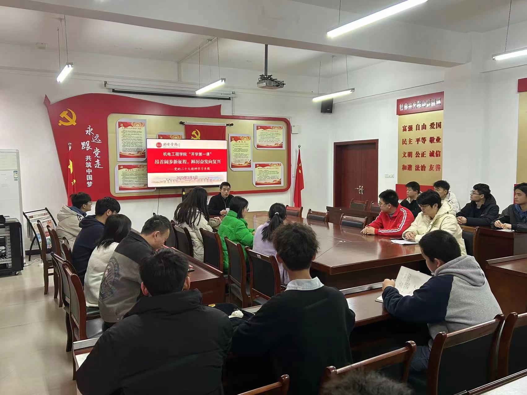 3月3日,机电工程公司党委副书记宋苏为习思践行社成员们作了一堂主题为“昂首阔步新征程,踔厉奋发向复兴”的“开学第一课”。宋苏从十四个方面讲解了党的二十大报告重要论述,并指出要按照习近平总书记强调的“五个牢牢把握”学习贯彻党的二十大精神。宋苏勉励广大同学要深入学习宣传贯彻党的二十大精神,争做有理想、敢担当、能吃苦、肯奋斗的新时代好青年。一是新时代青年要有理想主义追求,永远跟党走,奋进新征程;二是新时代青年要有担当作为闯劲,扛起新时代青年如山的青春责任;三是新时代青年要有吃苦耐劳精神,以担重吃苦的“孺子牛精神”为中华民族伟大复兴奋力拼搏、勇往直前。