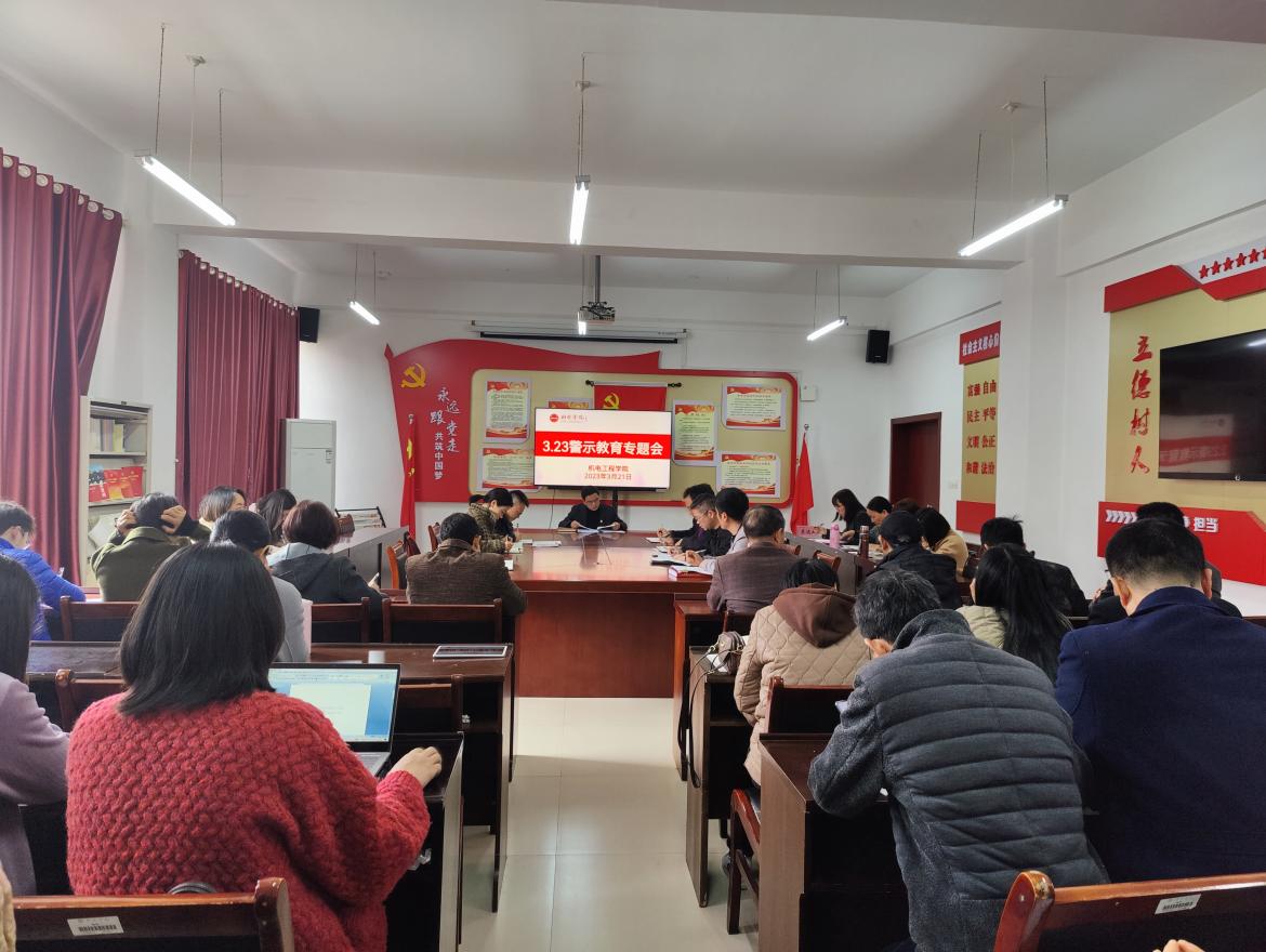 3月21日下午,机电工程学校在党员活动室召开了“3.23”警示教育专题会,学院全体教师参加会议。会议传达了学习学校关于《世界足球官网“3.23”警示教育活动工作方案》的通知。会议结合党支部组织生活会,要求全公司党员干部对照习近平总书记关于党风廉政建设和反腐败斗争的重要论述及全面从严治党的有关规定、“三个务必”、“赶考精神”等深化作风建设的相关要求,结合自身工作和思想实际,认真对照剖析,以问题为导向积极进行整改。