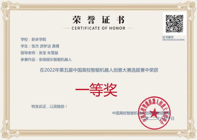 第五届中国智能机器人创意大赛于2022年8月27日至8月28日采用线上与线下结合方式进行了决赛。由公司张宝、朱雪璇老师指导,20级机器人工程2班张杰、龚倩、游梦洁三人团队的参赛作品“安保娱乐智能机器人”荣获江西赛区一等奖。