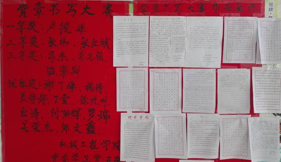 本次党章书写大赛主题为“书写信仰,书写青春”,比赛采取硬笔书写形式。大家在此次比赛中挑战了自己的书写能力,展示了书写水平,同时在不知不觉中深化了对党章内容的领悟,对党的纲领的理解。比赛评出了一等奖1名,二等奖2名,三等奖3名,优胜奖10名,对获奖作者进行了奖励,并进行了作品展示。