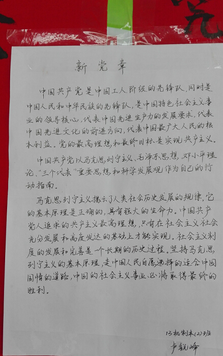 为庆祝建党95周年,同时进一步开展“两学一做”学习教育,让员工党员、发展对象和入党积极分子深入领悟党章内容,理解党的纲领,牢记党的宗旨,牢记党员义务和权利,引导他们尊崇党章、遵守党章、维护党章,更加坚定理想信念。公司隆重举办了“两学一做”学习教育暨庆“七一”党章书写比赛活动,公司所有员工党员、发展对象和入党积极分子积极参加了本次活动。