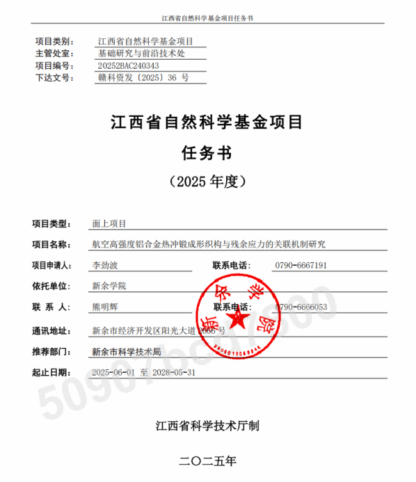 9 | 航空高强度铝合金热冲锻成形织构与残余应力的关联机制研究 | 江西省自然科学基金 | 李劲波 | 江西省科学技术厅 | 202507-202812 | 10 |