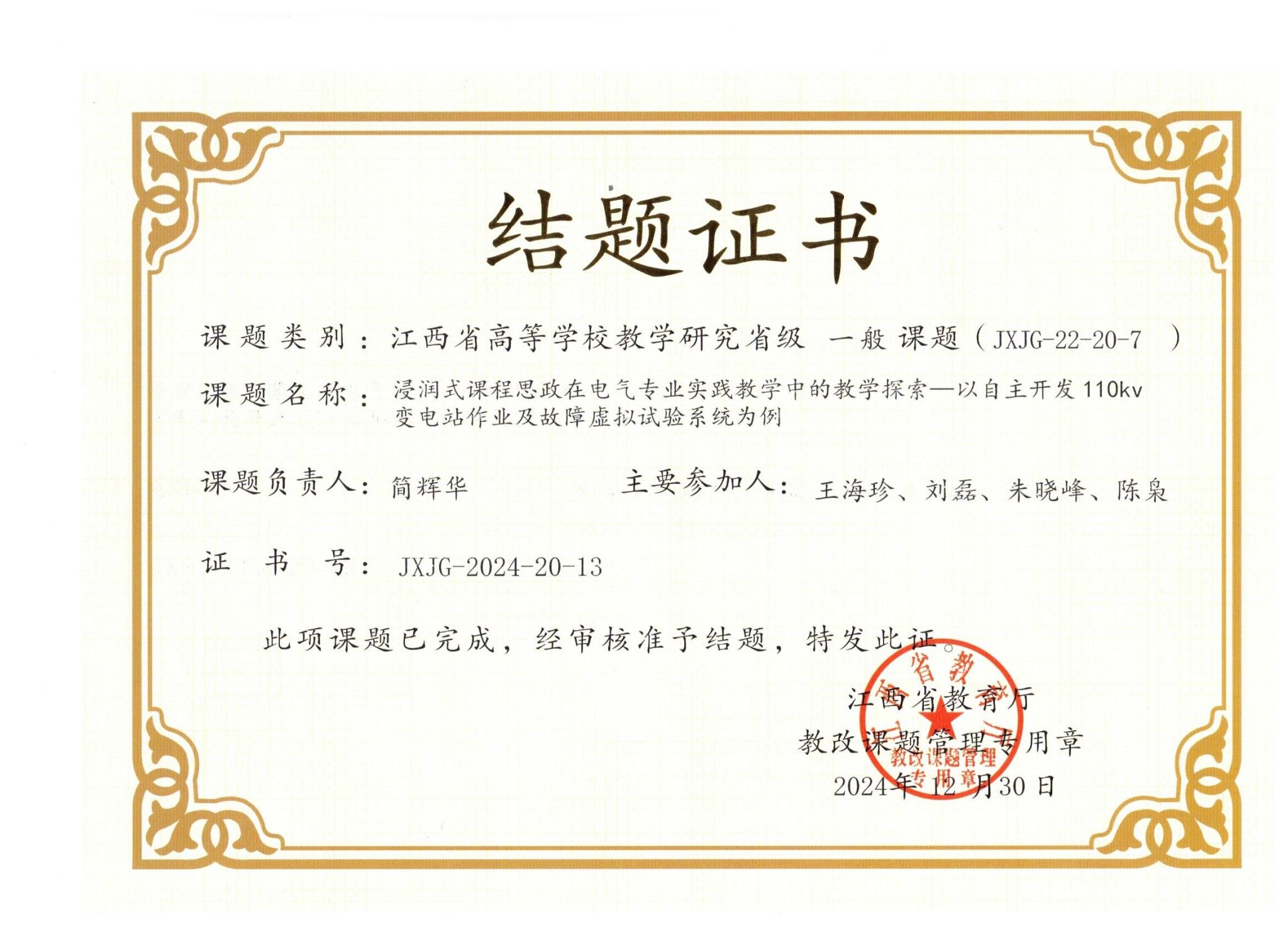 9 | 浸润式课程思政在电气专业实践教学中的教学探索-以自主开发110KV变电站作业及故障虚拟试验系统为例 | 江西省教改项目 | 江西省教育厅 | 简辉华 | 2022 |