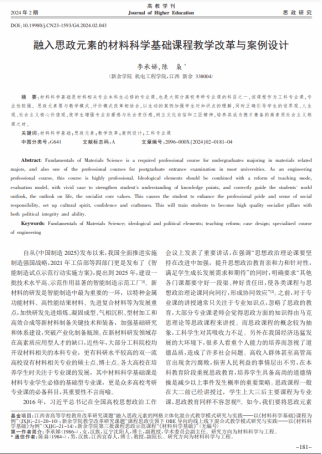 11 | 融入思政元素的《材料科学基础》教学改革与案例设计 | 高教学刊 | 李承娣 | 2024 |