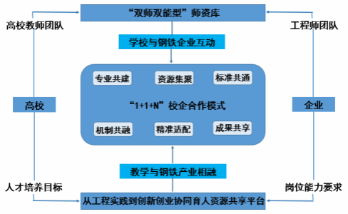 钢铁产业学院将企业资源和职场要素融入公司产品全过程,本着立德树人、以生为本、工程教育基本理念,构建“八共一体”育人新模式及“2+1+1+校企多轮切换”人才培养模式。