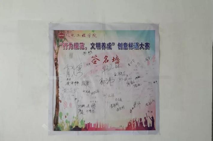 全院员工积极响应,提交作品百余份,公司根据评选规则评选出了优秀标语,将优秀标语作成条幅展示,随后组织全院同学参与“行为规范,文明养成”签名墙活动。